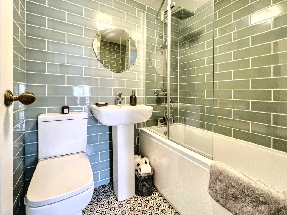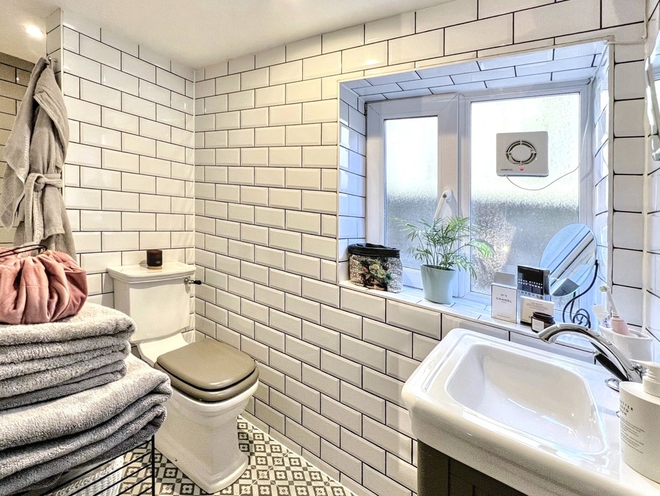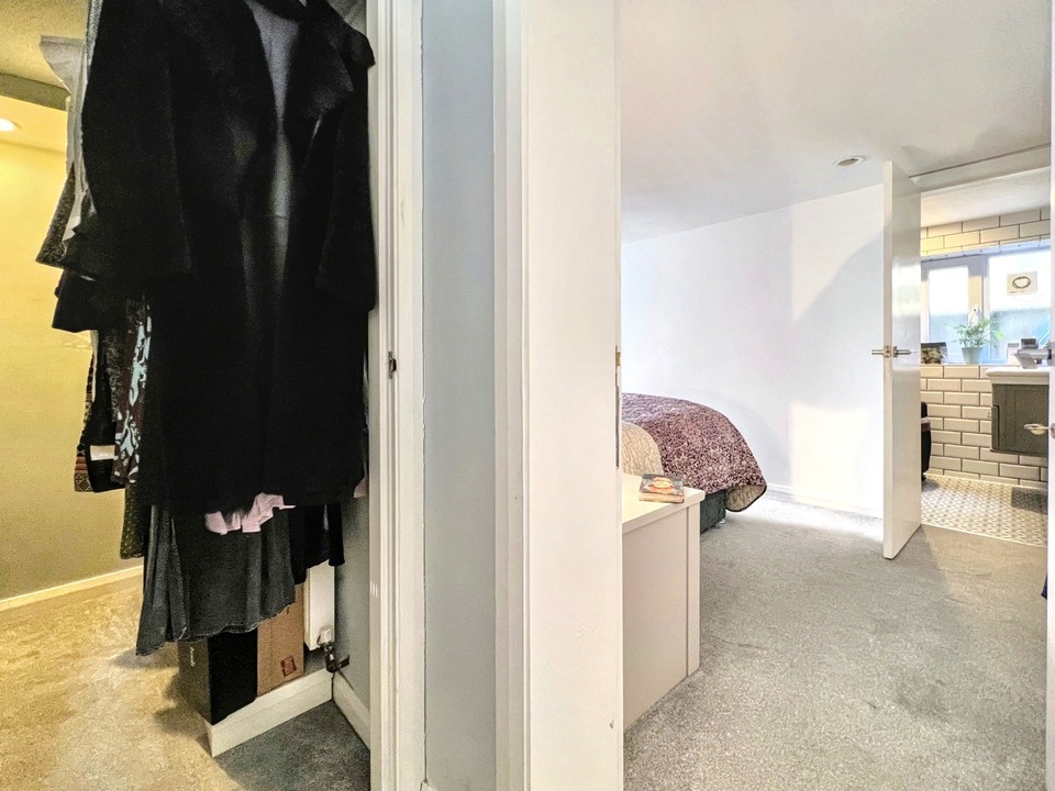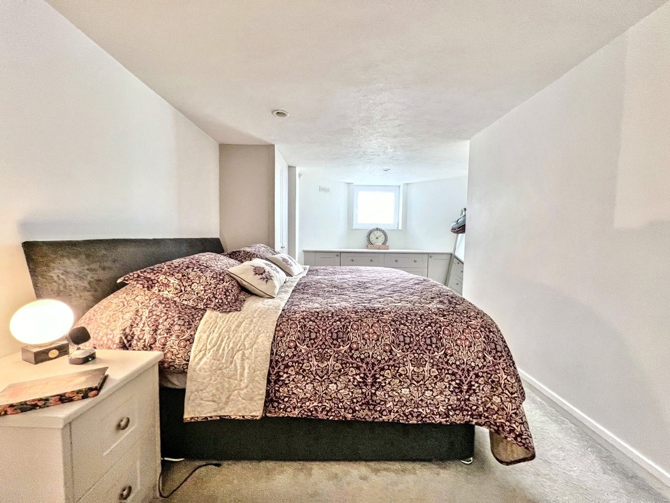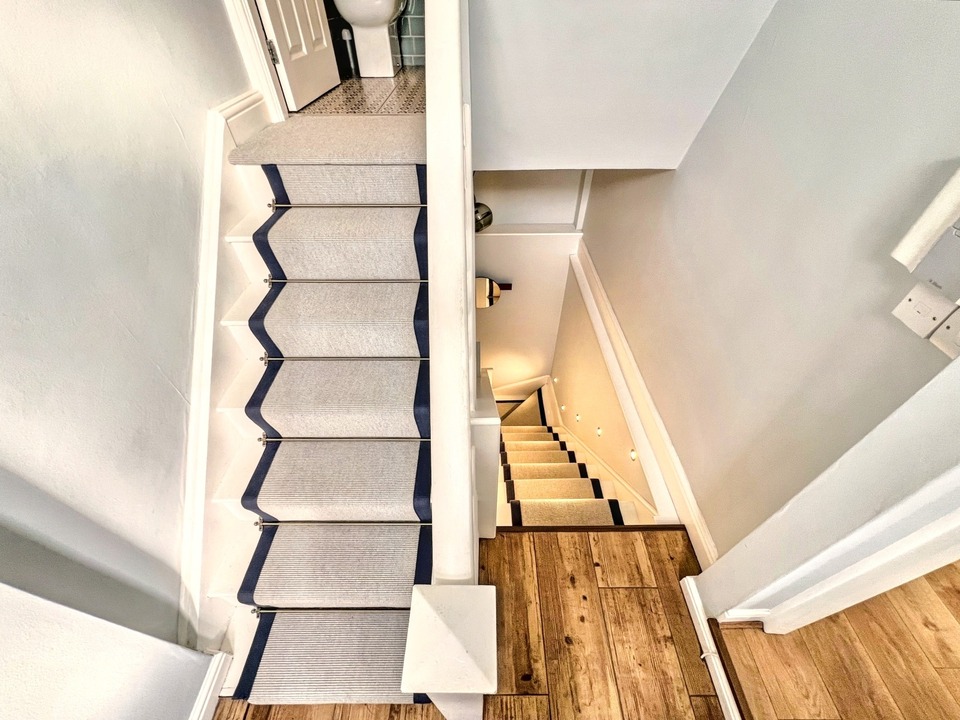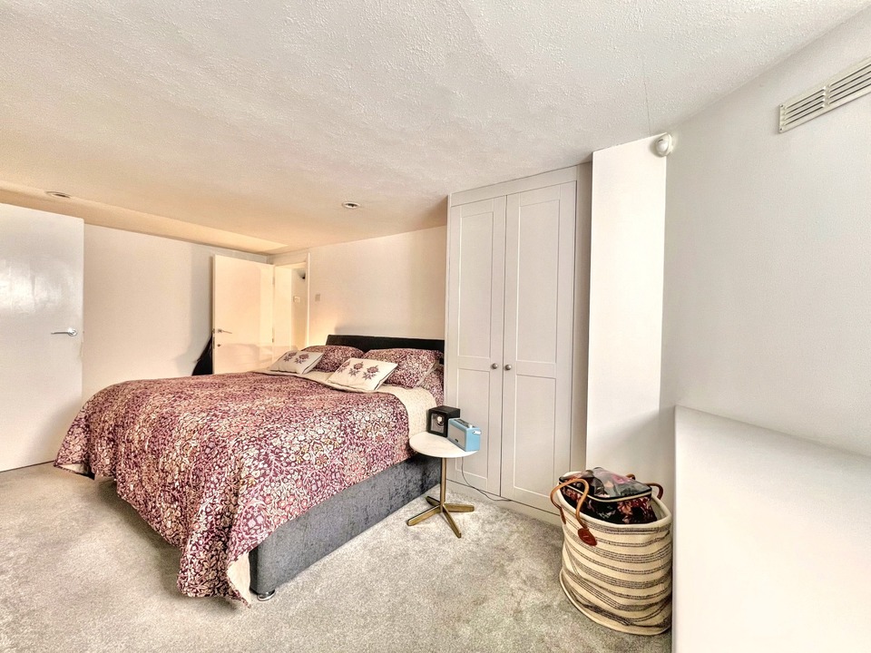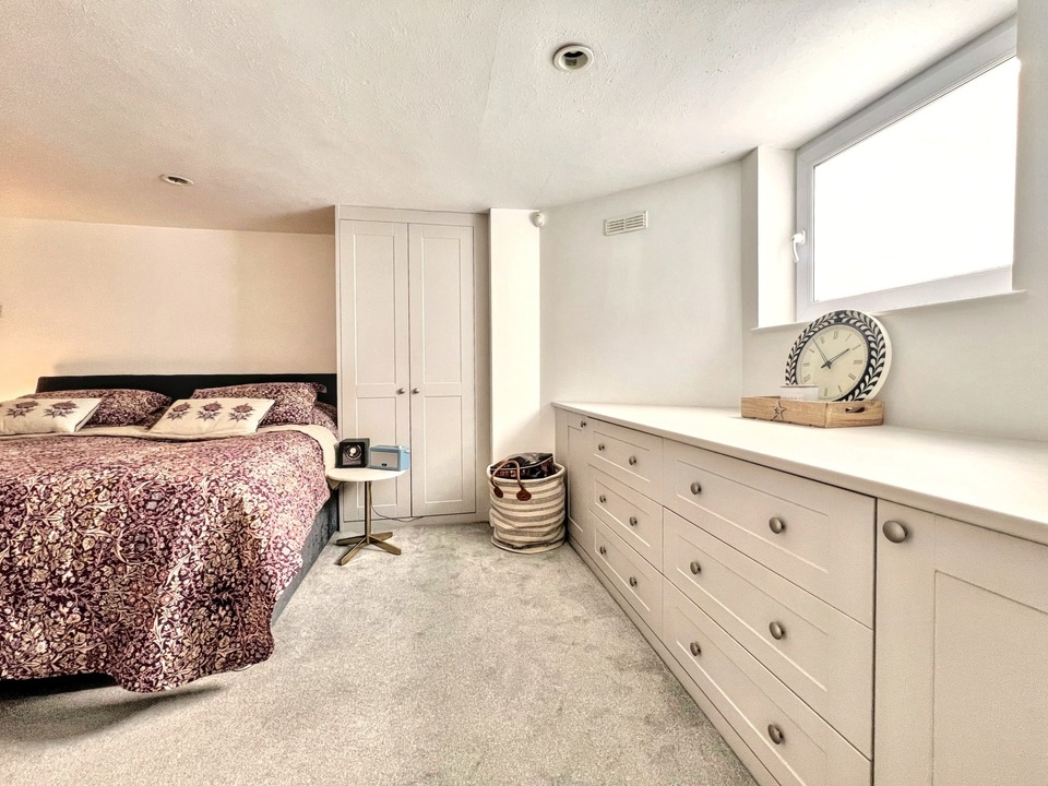 On the first level, you’ll find a stylish bathroom, and as you head downstairs, there is a spacious main bedroom with plenty of built storage and another sleek bathroom.