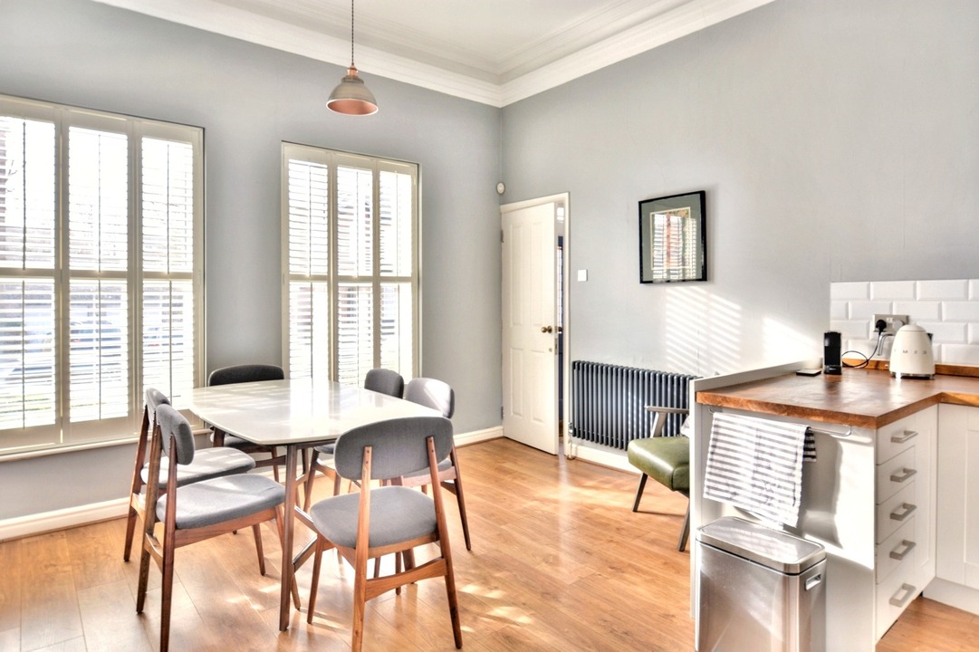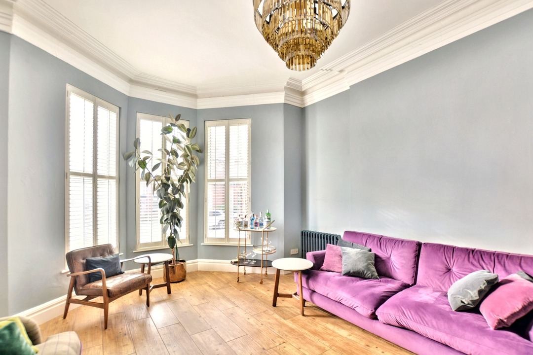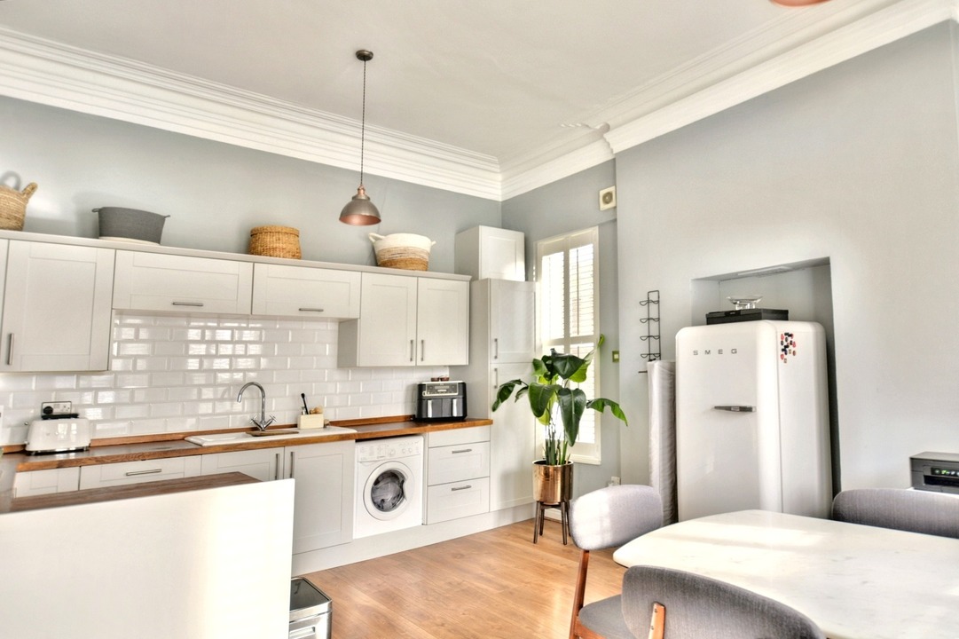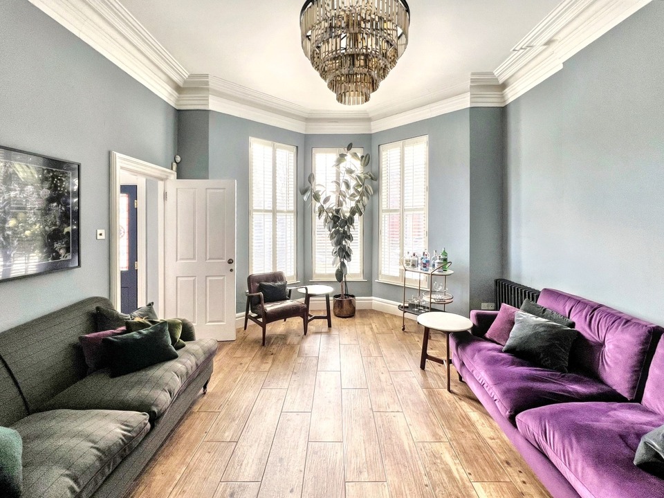 This split-level apartment has its own grand entrance and is full of beautiful period features. There is a gorgeous modern kitchen and living space, along with a separate lounge that lets in plenty of natural light from the bay window.