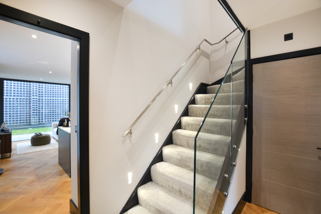The living space includes a comfortable lounge with floor to ceiling glass corner windows, a beautiful SieMatic kitchen open to a stunning living / dining space with more beautiful floor to ceiling windows and sliding doors spanning the back of the house. There is also a ground floor w.c.