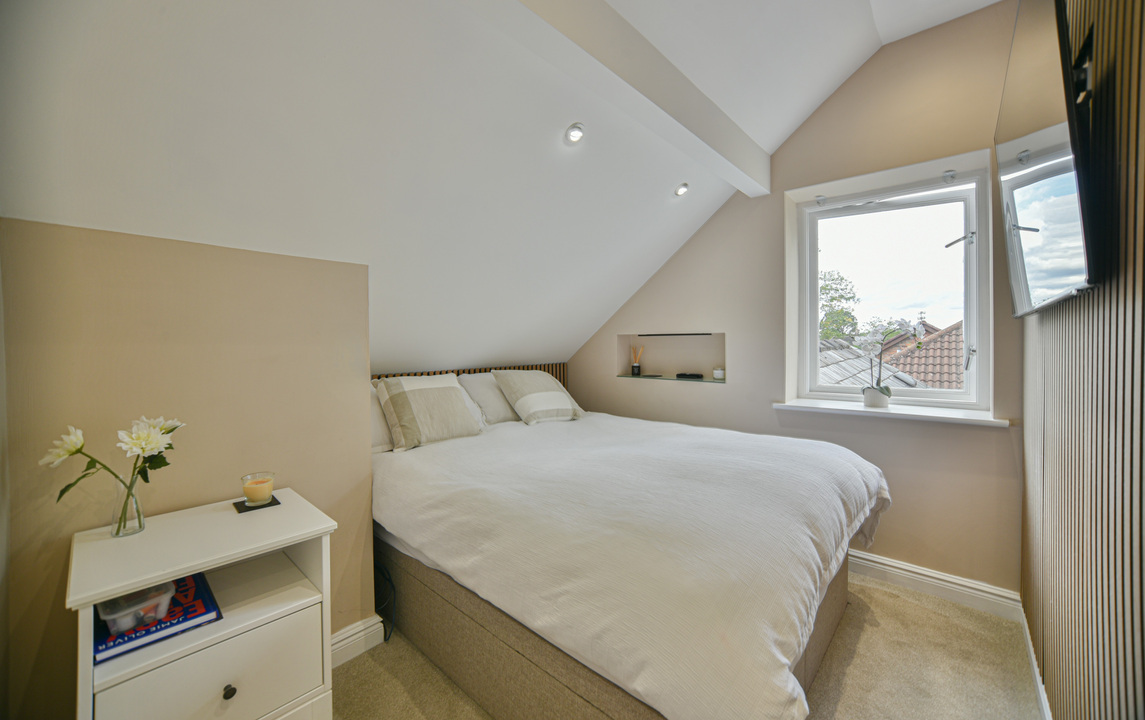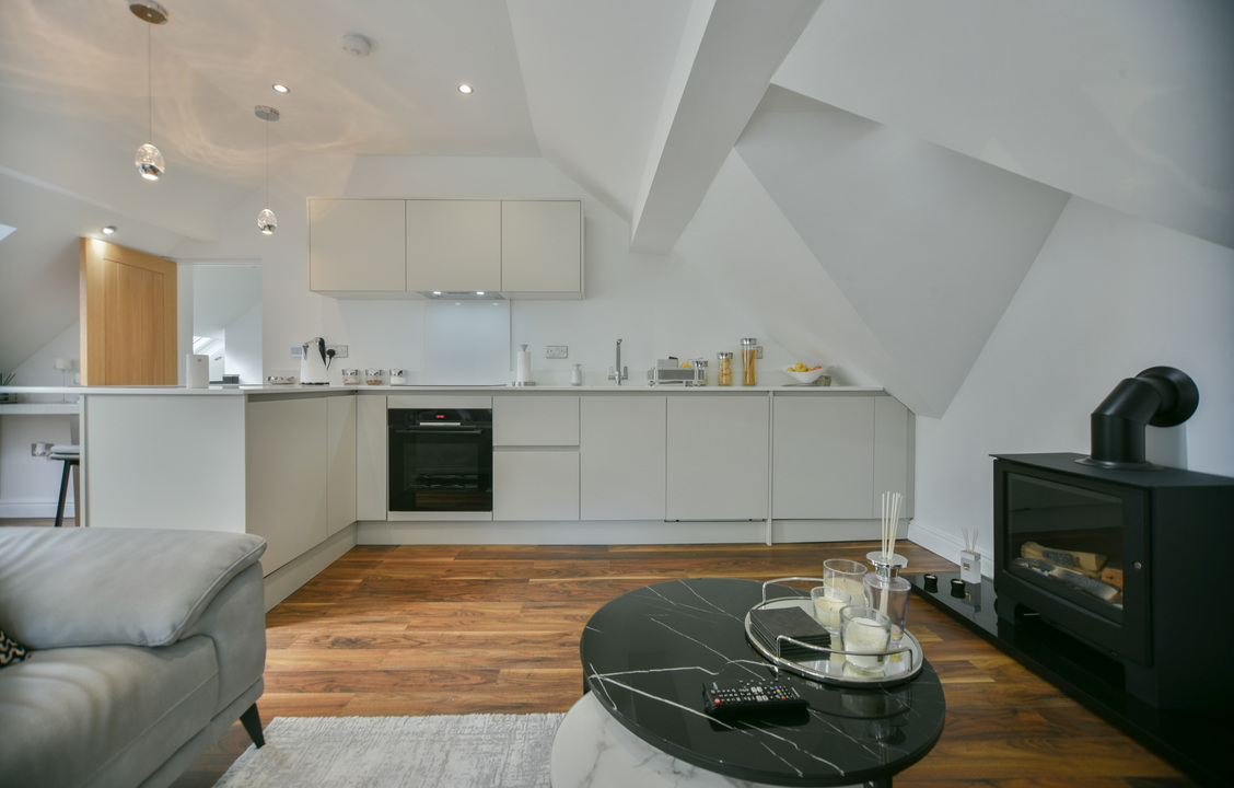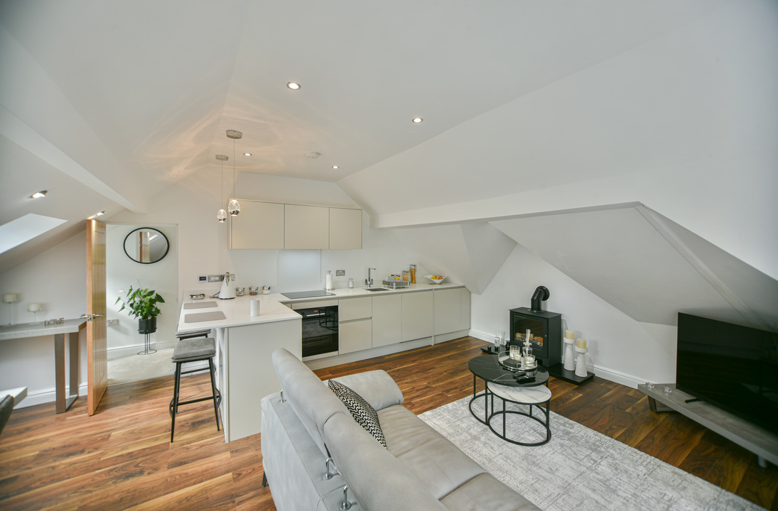 Inside, the open-plan living area makes an immediate impact. Bursting with natural light, it showcases unique features, character details, and a strong sense of style. The bespoke kitchen offers ample storage and high-end integrated appliances, seamlessly flowing into the spacious living and dining zone, complete with a statement fireplace.