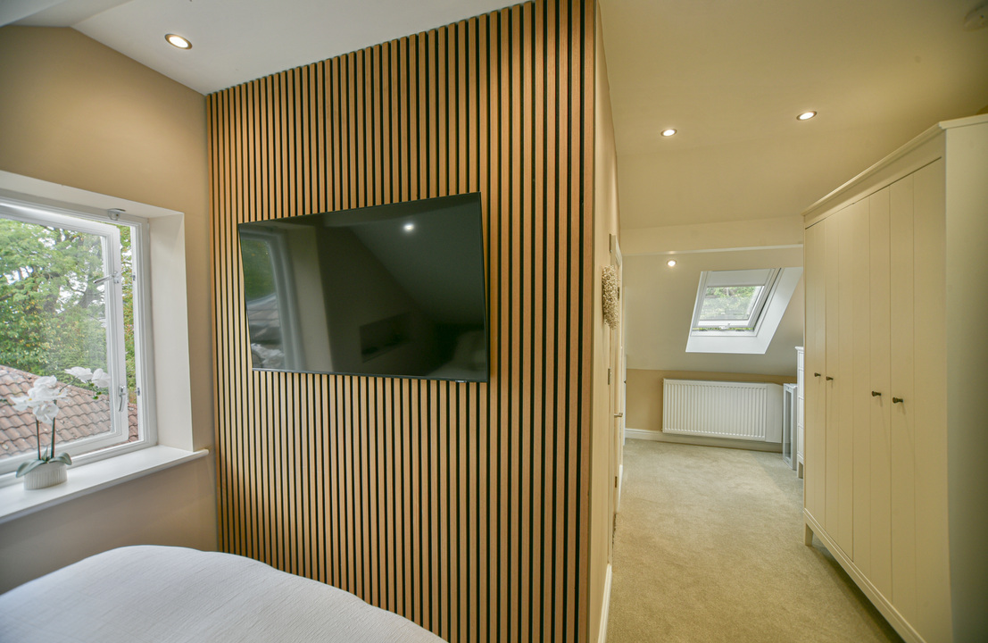 The bedroom suite exudes luxury, thoughtfully designed with a dedicated sleeping area, a generous walk-in wardrobe, and a beautifully appointed bathroom. A practical additional storage cupboard further enhances the functionality of the space.